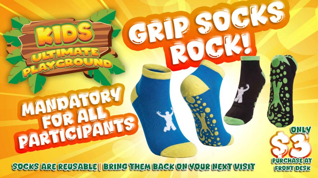 *Kids Ultimate Playground BRAND NON-SLIP SOCKS are mandatory. Outside grip or slip socks not accepted.